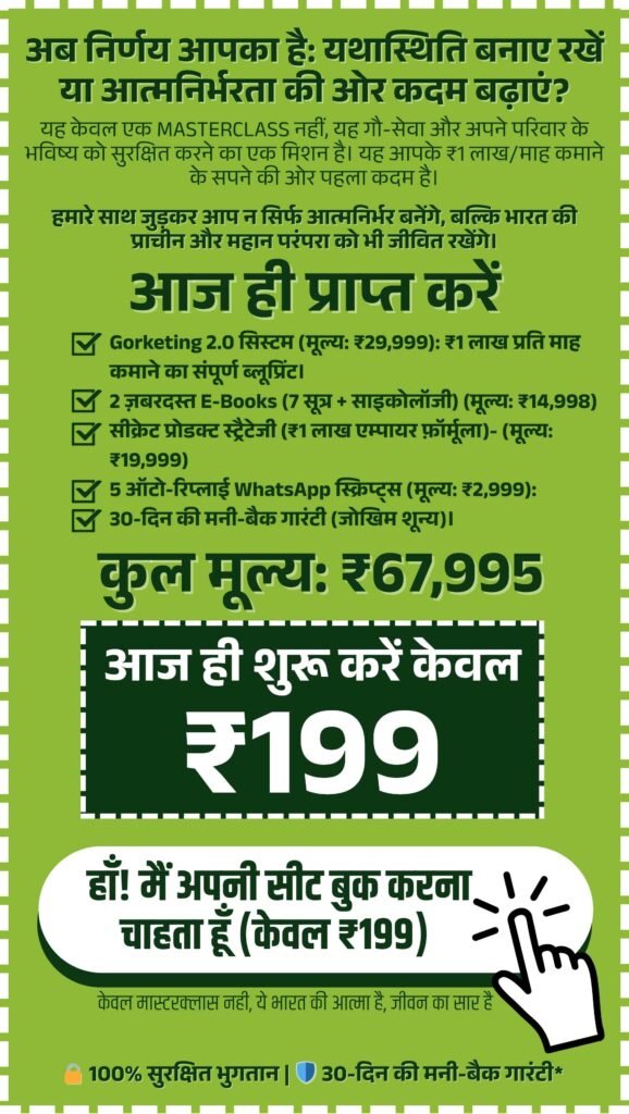 ✅ शून्य से शुरुआत करके देसी गाय के उत्पादों से पहला ₹1 लाख प्रति माह कमाना चाहते हैं।
