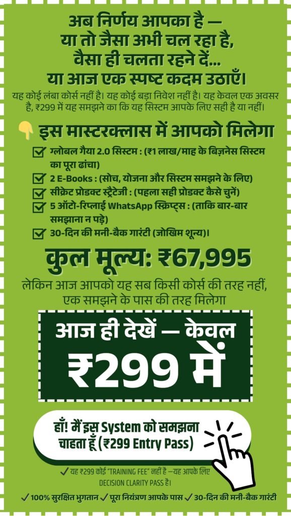 ✅ शून्य से शुरुआत करके Global Gaiya™ framework ke practical vehicle ke साथ पहला ₹1 लाख/माह का clear roadmap चाहते हैं।